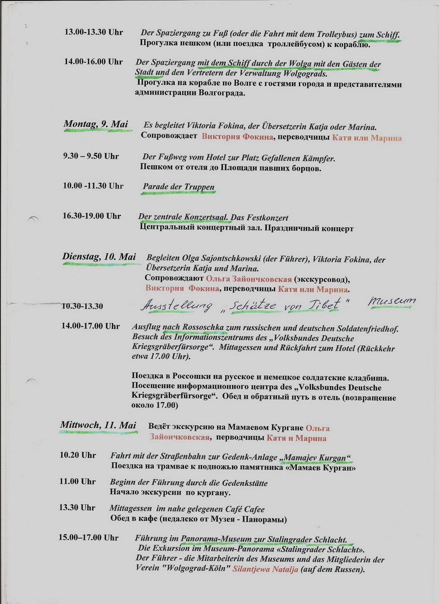Diese Veranstaltung gehörte zum Programm der Stadt anlässlich des "Tag des Sieges" und stand unter dem "Kommando" von Sergey Lapschinow, Amt für internationale Beziehungen der Stadtverwaltung Wolgograd. Dank der guten Beziehungen von Victoria zu Herrn Lapschinow ist es mir als Gast vergönnt an dieser denkwürdigen Schifffahrt auf der Wolga teilzunehmen. Neben Herrn Lapschinow - perfekt in deutsch - lerne ich u.a. Juri Starovatikh, Ehrenbürger der Heldenstadt Wolgograd und Juri Ratnikow, Oberst und Leiter des Katastrophenschutzes kennen. Das Sprachgewirr an Bord lässt erahnen, dass verschiedene ausländische Delegationen eingeladen sind u.a. aus Deutschland ein Architekt aus Kassel, Herr von Reuß mit Frau und ein Gemeinderat der Gemeinde Denkendorf/Bayern, Herr Christian Holtz. Erst später habe ich erfahren, dass Herr von Reuß der Architekt des Soldatenfriedhofes Rossoschka ist und er nunmehr wieder angereist war, um mit finanzieller Unterstützung der Gemeinde Denkendorf eine Neugestaltung des Friedhofes zu planen.
